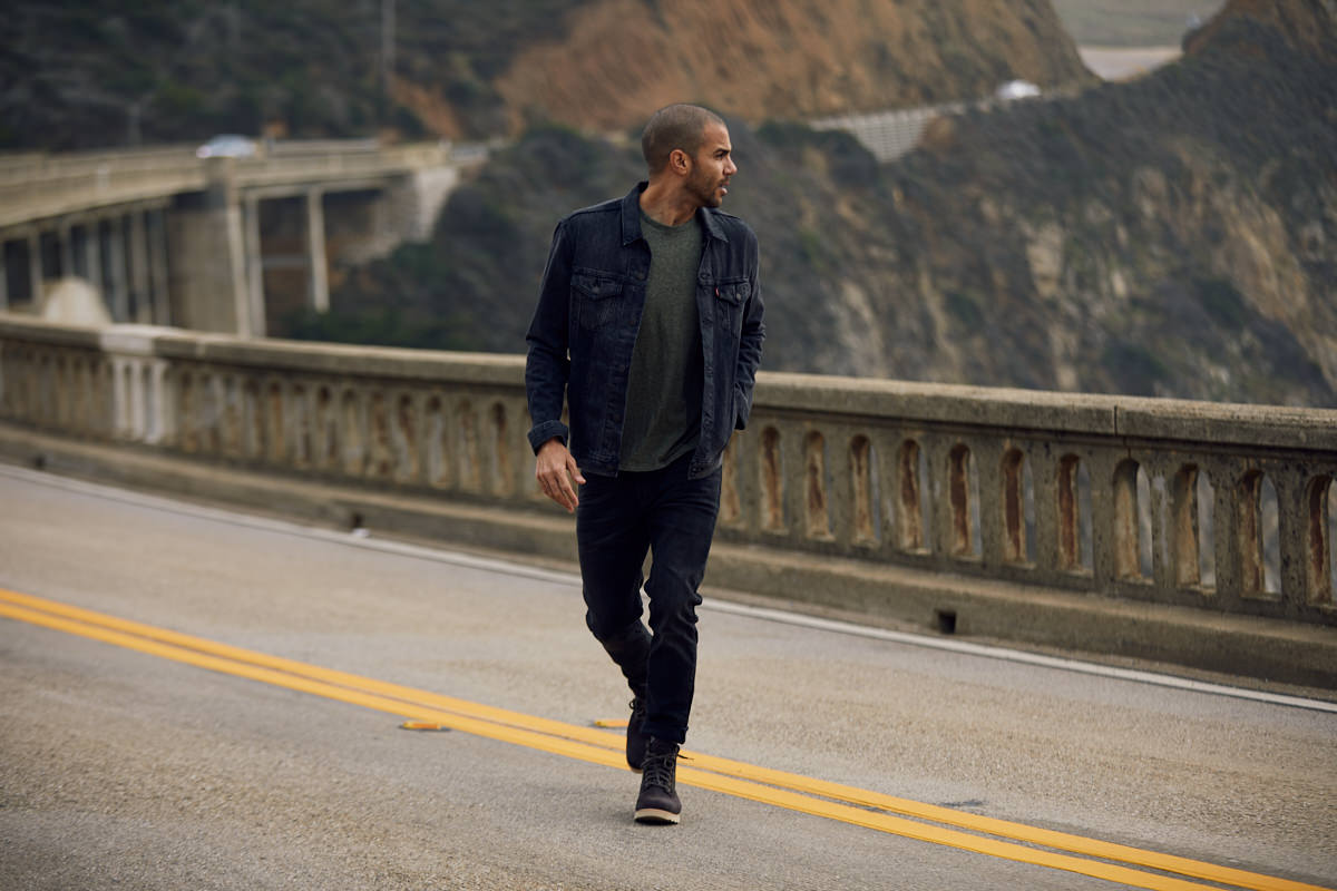 A lifestyle photo of Justin Smith walking across a street while looking off into the distance at the mountains.