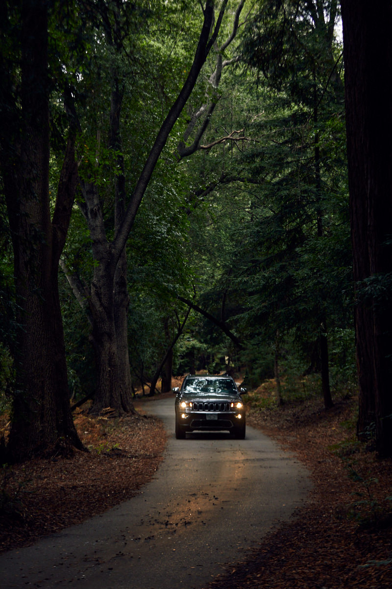 2018 Jeep Grand Cherokee, with its headlights on, driving down a path in the Pfeiffer Park