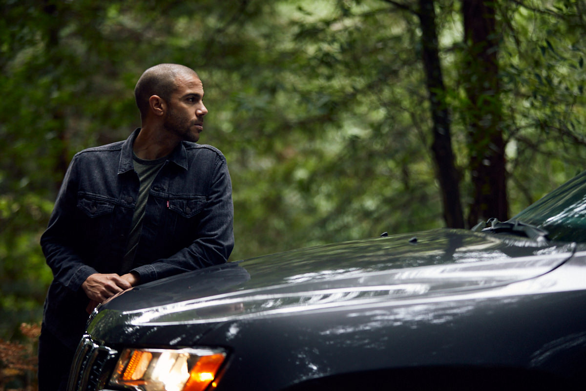 A lifestyle shot of Justin Smith leaning on the hood of a 2018 Jeep Grand Cherokee SUV in a dark forest.