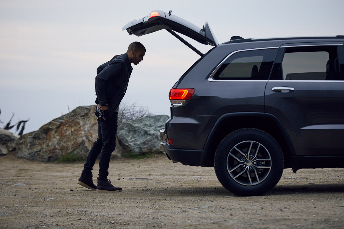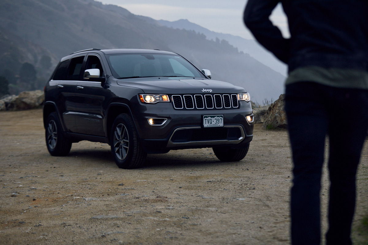 2018 Jeep Grand Cherokee parked with its lights on in front of mountains with Justin Smith walking in the foreground